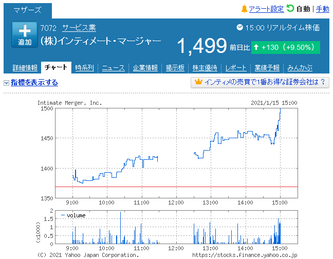 このことが原因だったかどうかは分かりかねますが、同社の株価は本日引けにかけてかなり上がりました。引け後に決算発表を予定している会社でこのような値動きしている会社はちらほら見かけます。