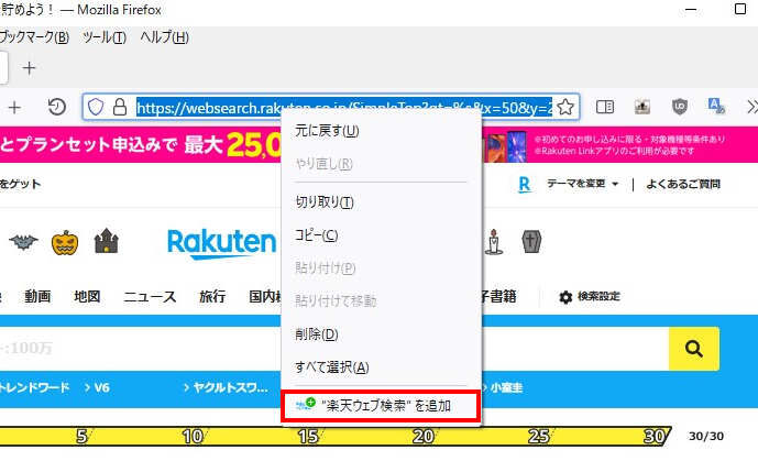 コンテキストメニューの下に「"楽天ウェブ検索”を追加」という項目が現れます。 - この「"楽天ウェブ検索”を追加」をクリックすると検索エンジンが追加されます。