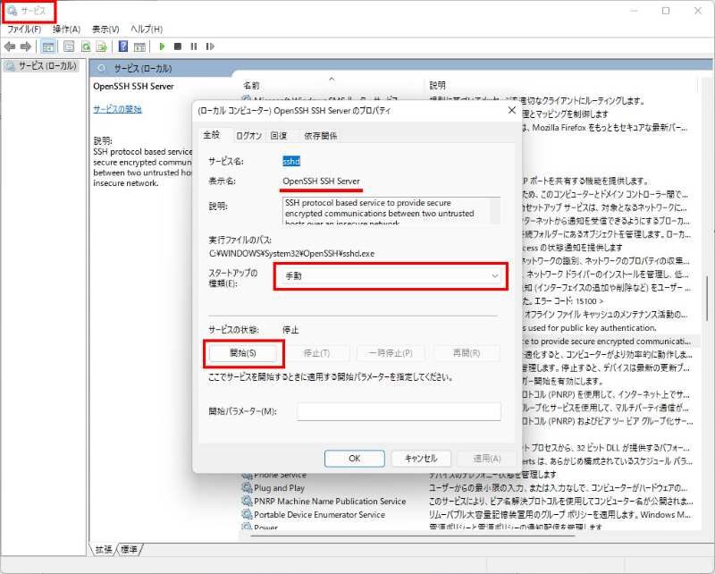 - インストールが終わったら、サービス管理ツールから[OpenSSH SSH Server] を選択して、プロパティから、[開始(S)]ボタンをクリックして、サービスを開始します。